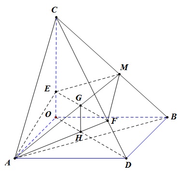 $1$. Chọn $Oxyz$ làm hệ trục tọa độ trong không gian thì \(A\left( {a,0,0} \right);B\left( {0,a\sqrt 2 ,0} \right);D\left( {a,a\sqrt 2 ,0} \right);C\left( {0,0,c} \right);M\left( {0,\frac{{a\sqrt 2 }}{2},\frac{c}{2}} \right)\) Véc tơ chỉ phương \(\overrightarrow \alpha \left( {u,v,{\rm{w}}} \right) \ne 0\) của giao tuyến $(P)$ với $(OCD)$ phải thỏa mãn: \(\overrightarrow \alpha ,\overrightarrow {OC} ,\overrightarrow {OD}\) đồng phẳng, tức là \(\overrightarrow \alpha = s.\overrightarrow {OC} + t.\overrightarrow {OD} = \left( {ta,ta\sqrt 2 ,sa} \right){\rm{ }}\left( {s,t \in R} \right)\) \(\overrightarrow \alpha .\overrightarrow {AM} = 0\) mà \(\overrightarrow {AM} \left( { - a,\frac{{a\sqrt 2 }}{2},\frac{c}{2}} \right) \Rightarrow - t{a^2} + ta\sqrt 2 .\frac{{a\sqrt 2 }}{2} + s\frac{{ac}}{2} = s\frac{{ac}}{2} = 0\) Vậy $s = 0$ và ta có thể coi \(\overrightarrow \alpha = \overrightarrow {OD} = \left( {a,a\sqrt 2 ,0} \right)\) Mặt phẳng $(P)$ qua $A(a, 0 , 0)$ với $2$ véc tơ chỉ phương \(\overrightarrow {AM} ;\overrightarrow \alpha \) nên có véc tơ pháp tuyến \(\overrightarrow n \left( {x,y,z} \right) \ne 0\) mà\(\left\{ \begin{array}{l} - {\rm{ax}} + \frac{{a\sqrt 2 }}{2}y + \frac{c}{2}z\\ {\rm{ax}} + a\sqrt 2 y = 0 \end{array} \right. = 0\) Vậy có thể chọn \(\overrightarrow y \left( {c\sqrt 2 , - c,3a\sqrt 2 } \right)\) Từ đó $(P)$ có phương trình \(c\sqrt 2 \left( {x - a} \right) - cy + 3\sqrt 2 z = 0\) $(P)$ cắt trục $Oz$ tại $E(0, 0, z)$ mà \( - ac\sqrt 2 + 3a\sqrt 2 z = 0 \Leftrightarrow E\left( {0,0,\frac{c}{3}} \right);OE = \frac{c}{3}\)
